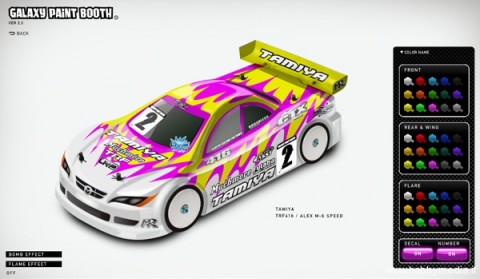 Pour ceux qui se gratte la tête pour savoir quel couleur choisir : un jeune graphiste et modéliste nippon a développé le site GALAXY PAINT BOOTH ; ou il est possible de tester différentes couleurs sur les carrosseries d'un Team Associated RC10 B4 et d'une Tamiya TRF416... même si limité à ces deux carrosseries, et aux motifs proposés, ca permet d'avoir une idée !